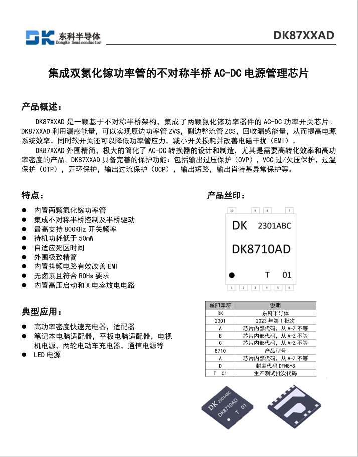 DK8715AD采用DFN8*8的封裝形式,適用于高功率密度快速充電器、適配器、筆記本適配器、平板電腦適配器、電視電源、兩輪電動(dòng)車充電器、通信電源、LED電源等領(lǐng)域之中。